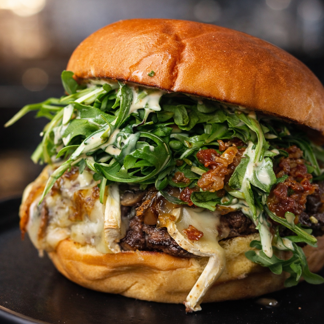 6oz Alberta Angus Beef, Garlic Pesto Aioli, Mushrooms, Caramelized Onion, Brie Cheese, Bacon Jam, Arugula.