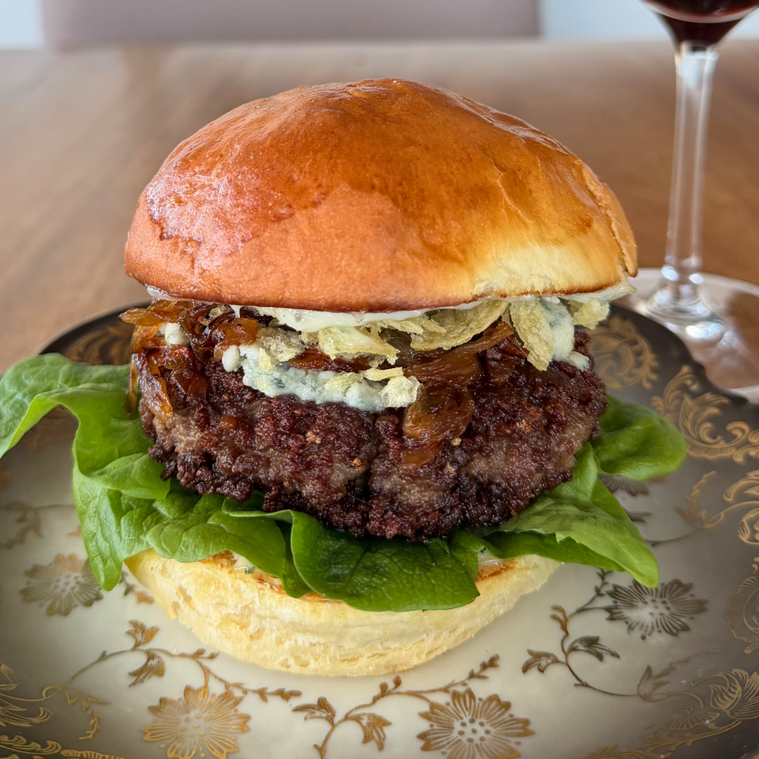A 6oz Patty topped with a Roasted Garlic and Blue Cheese Aioli, Caramelized Onions, Butter Leaf Lettuce and Potato Crunch.