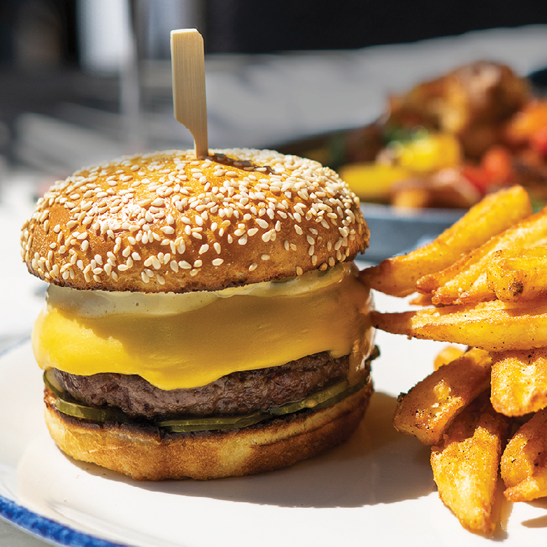 A Benchmark Aged Brisket Patty, American Cheese, Caramelized Onions and Pickles served on a Toasted Sesame Seed Bun.