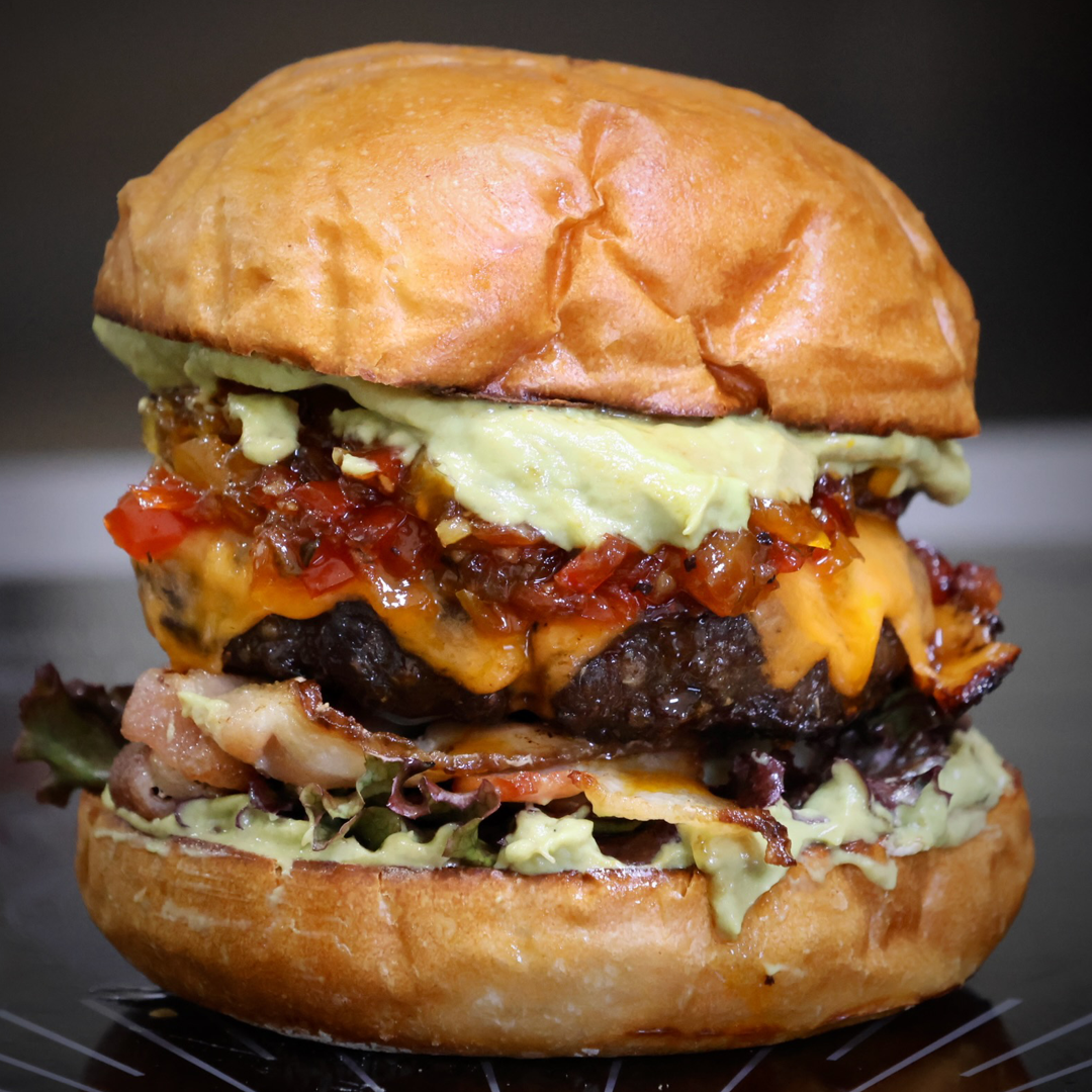 A Grilled Beef Chuck Patty topped with Swiss Cheese and Crispy Bacon, layered with Fresh Lettuce, Pepper Relish and Creamy Avocado Aioli on a Toasted Brioche Bun.