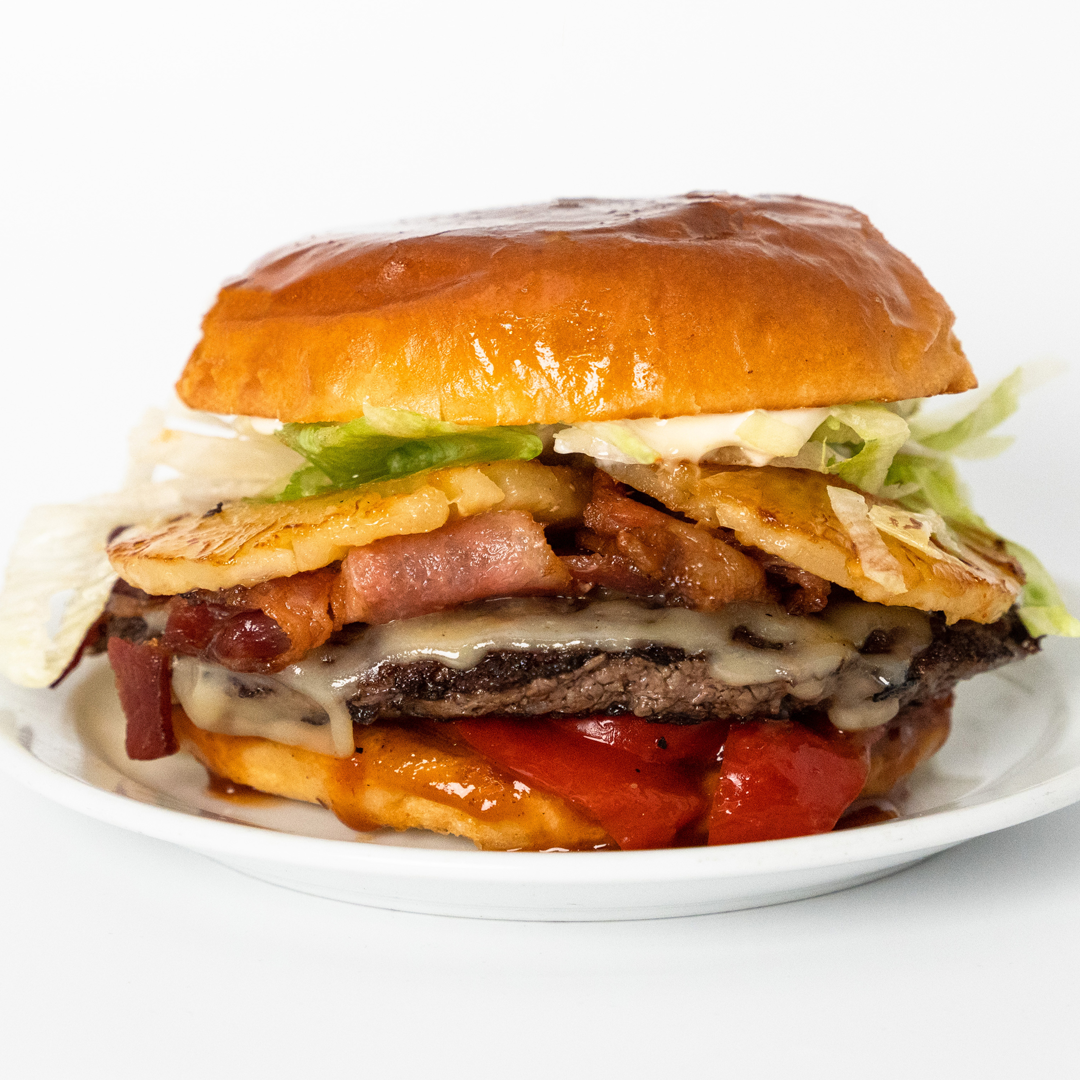Beef Patty, Grilled Pineapple, Bacon, Jack Cheese, Sautéed Peppers, Lettuce, BBQ Sauce, Mayo, Brioche Bun.