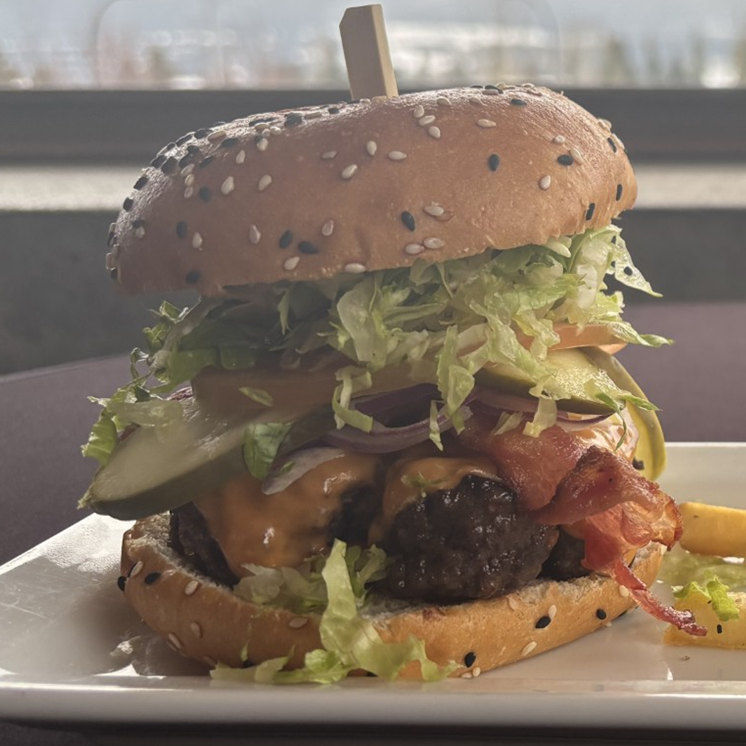 Certified Angus Beef, Canadian Cheddar Cheese, Bacon, House Sauce, Lettuce, Tomato and Red Onion Pickle.