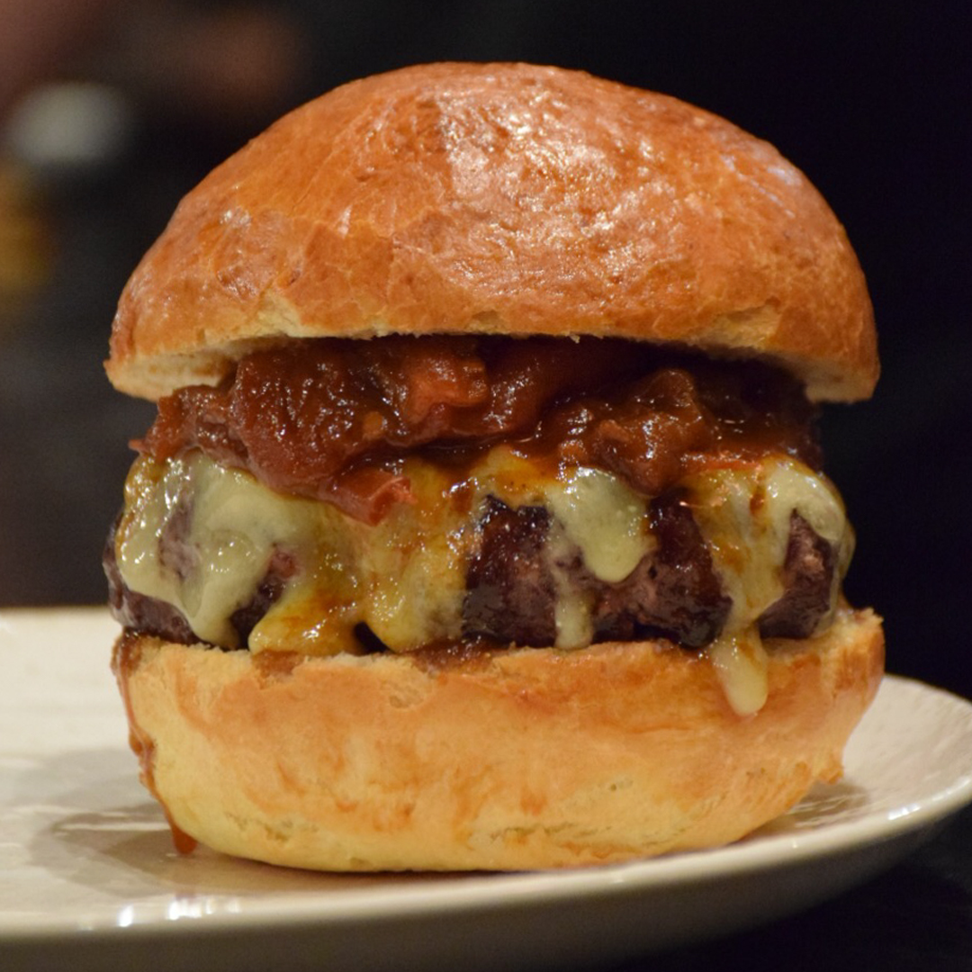An Alberta Beef Burger Patty, Crispy Onion, Aged Cheddar Cheese, Lettuce, and Aïoli served on a Toasted Bun.