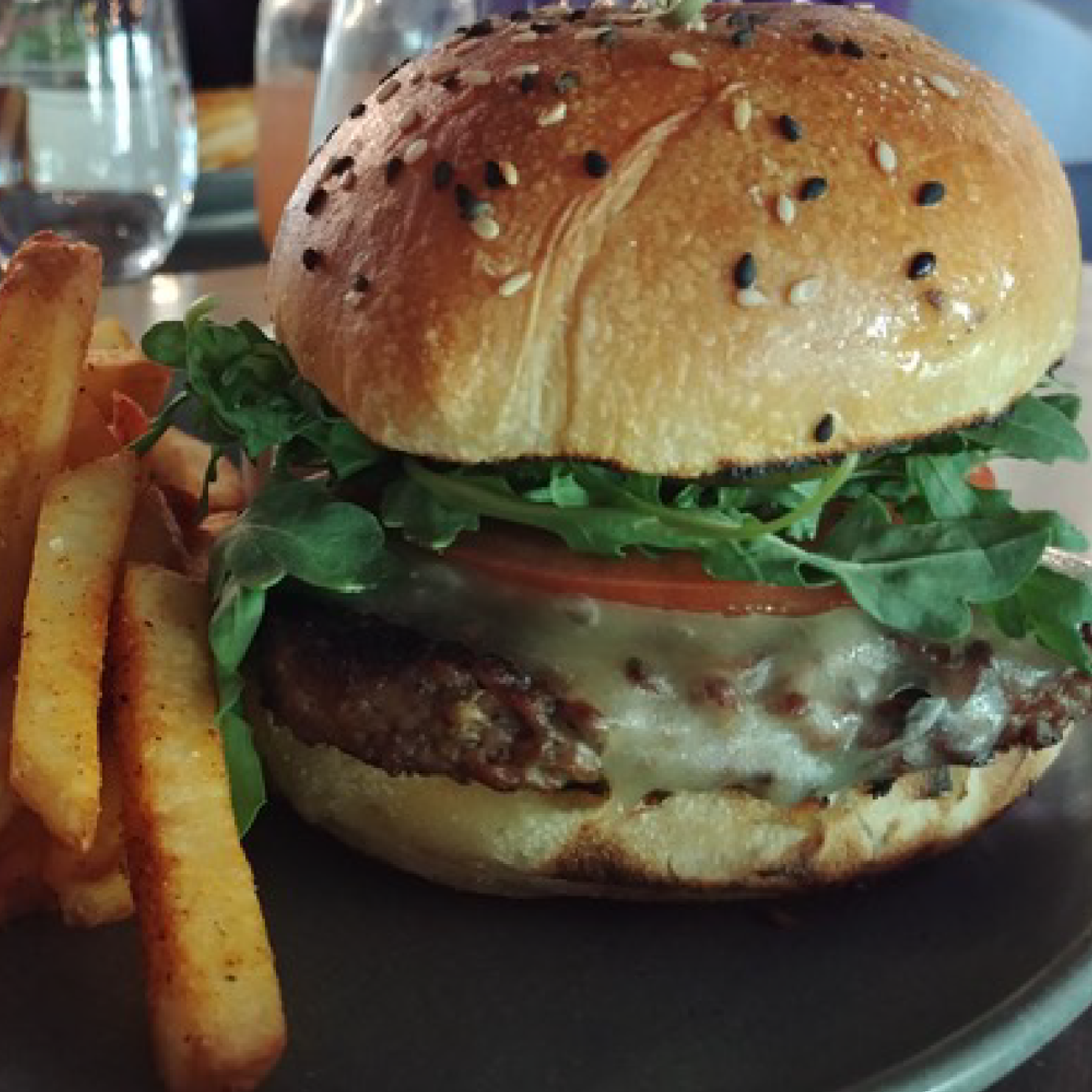 A 6oz Prime Rib Patty, Arugula, Tomato, Pickle and Gochujang Aioli served on a Brioche Bun.