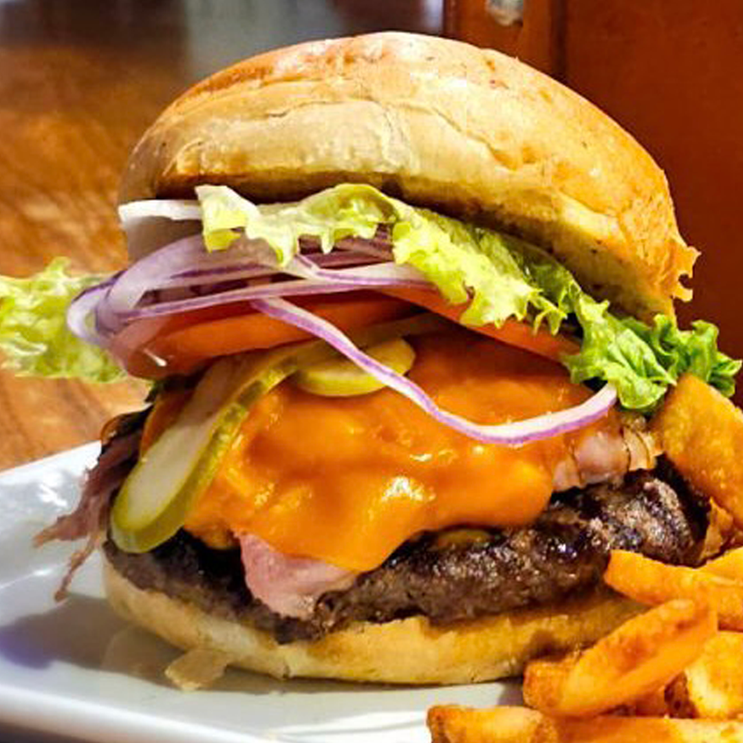 Angus Beef, Ham, Cheddar Cheese, Mushrooms, Lettuce, Tomato, Cheddar Cheese, Onion, In-House BBQ Mayo.