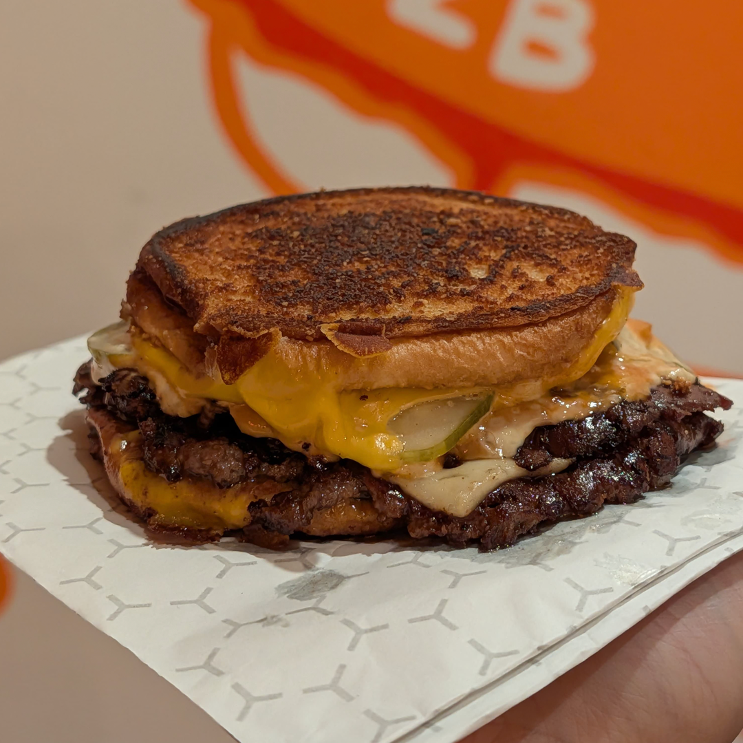 Two 3.25oz 100% Canadian Beef Smash Patties stacked with Melted Cheddar and Creamy Havarti, Tangy Pickles, Smokey Chipotle Sauce and our Signature B2B Sauce. All sandwiched between perfectly toasted Parmesan Butter Grilled Cheese Buns.