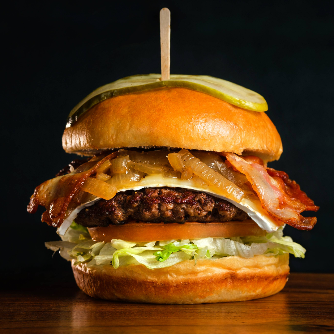 Brioche Bun, 6oz Certified Angus Beef, Brie Cheese, Bacon, Caramelized Onion, Grainy Dijon Mustard, Lettuce, Tomato, Blaze Sauce.