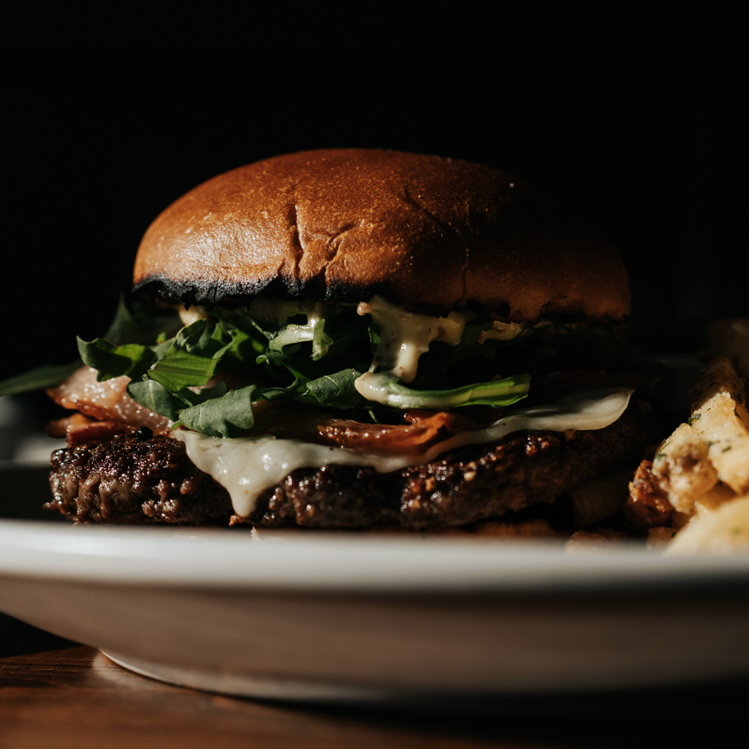 8oz Patty, Bacon, Arugula, Swiss Cheese, Grainy Mustard Aioli, Frites.