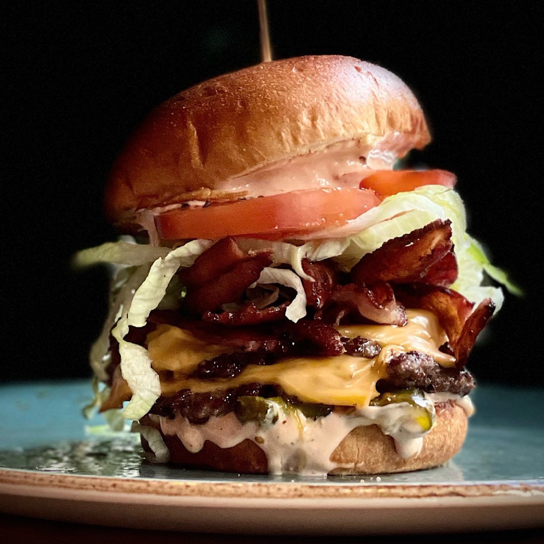 Beef, Cheese, Bacon, Lettuce, Tomato, Sweet Pickles, Caramba Sauce.
