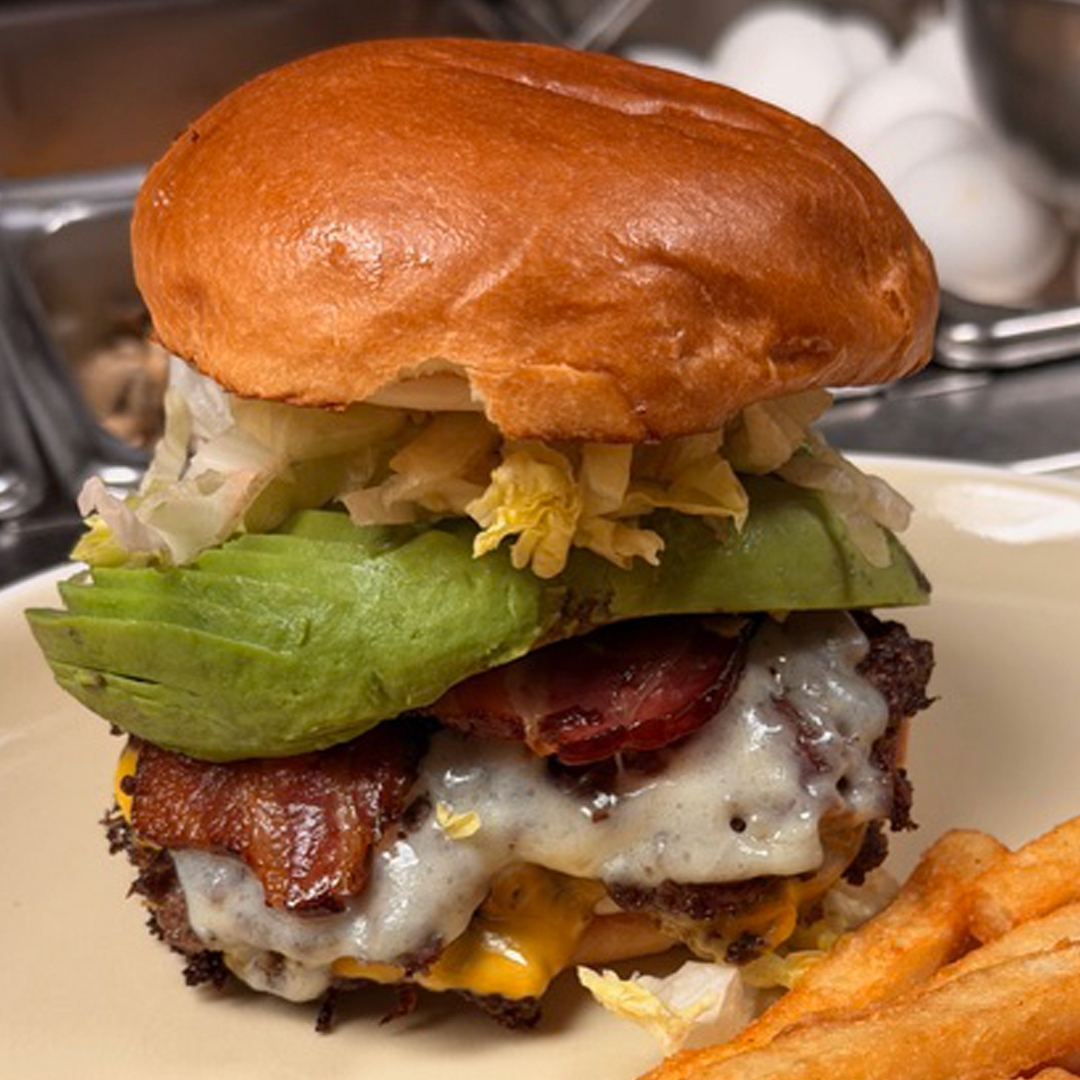 Two Beef Smash Patties, American Slice Cheese, Avocado, Canadian Cheddar Cheese, Streaky Bacon, Lettuce, Mayonnaise, Mustard, Potato Bun.