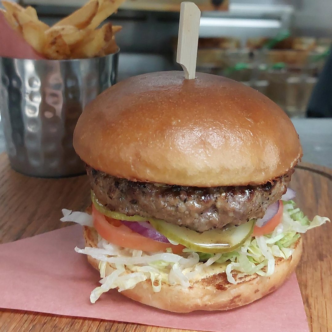 A Fresh 100% Canadian Beef Patty, Lettuce, Tomato, Red Onion, House Mayo and Pickles served on a Brioche Bun.