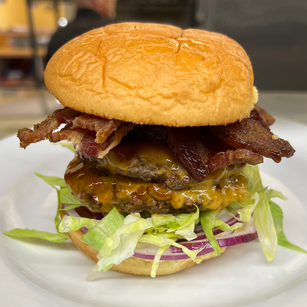 Two 3oz Canadian Beef Patties, Cheddar Cheese, 1/4" Thick Bacon, Lettuce, Tomato, and Onion served on a Classic Bun.