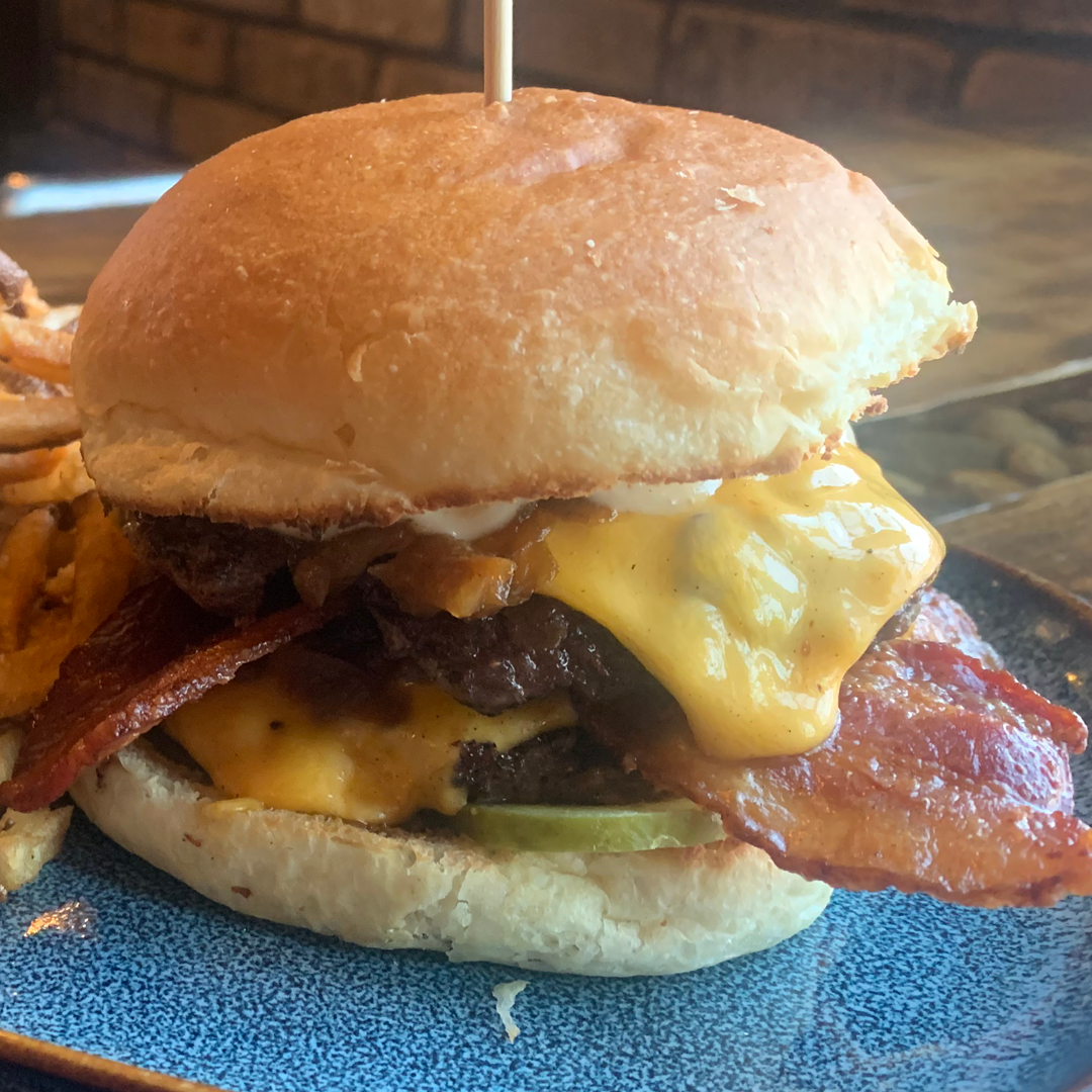 Two Juicy Brazen Beef Patties, Two Classic Cheese Slices, Bacon, Garlic Aioli, Sautéed Onions, Pickle Slices, Spicy Brazen Ketchup on a Fresh Made Bun.