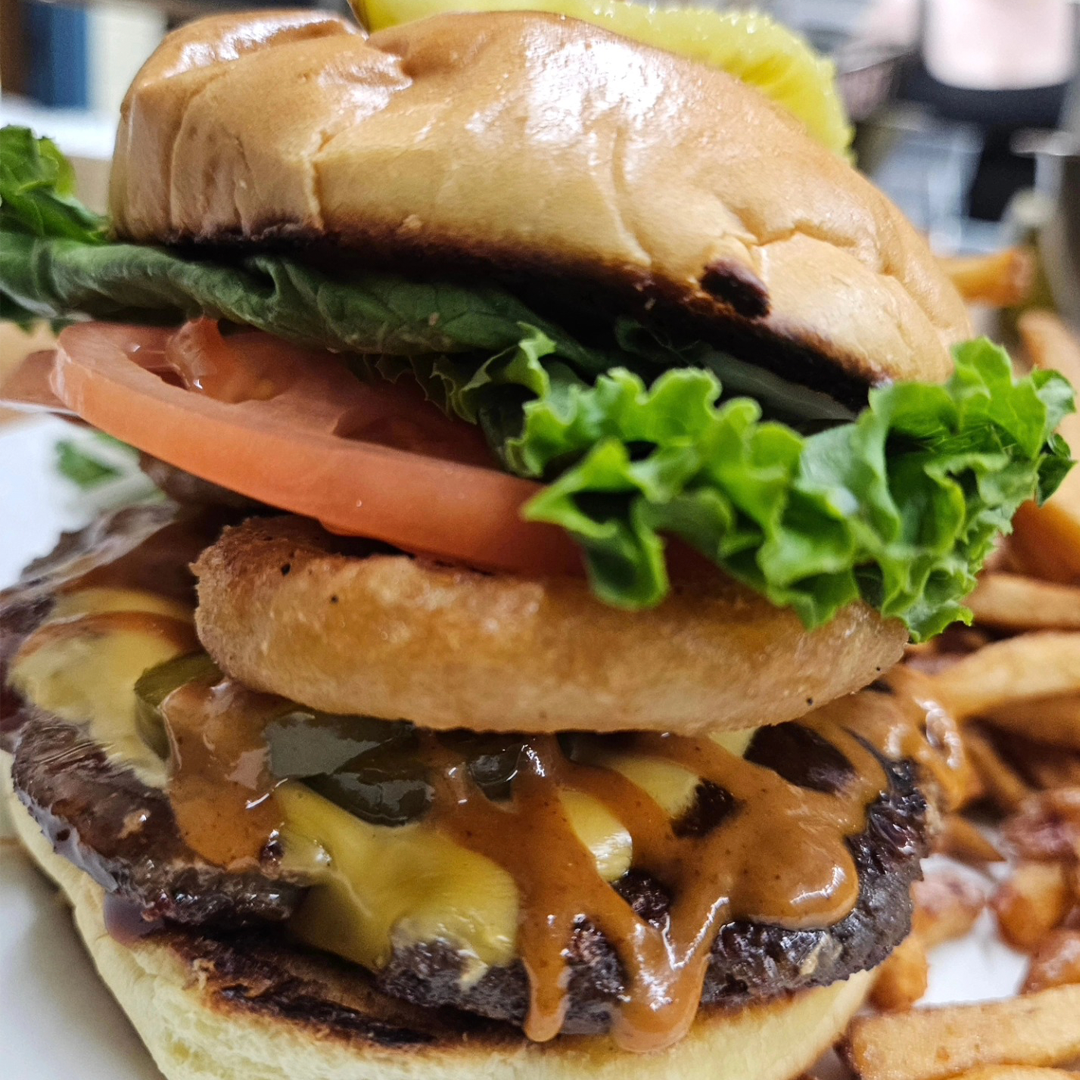 Our Homemade Canadian Beef Patty, Mayo, Lettuce, Tomato, Pickles, Caribbean BBQ Sauce, Cheddar Cheese, Onion Rings, JalapeƱos, and Chipotle Sauce Drizzle served on a Toasted Bun.