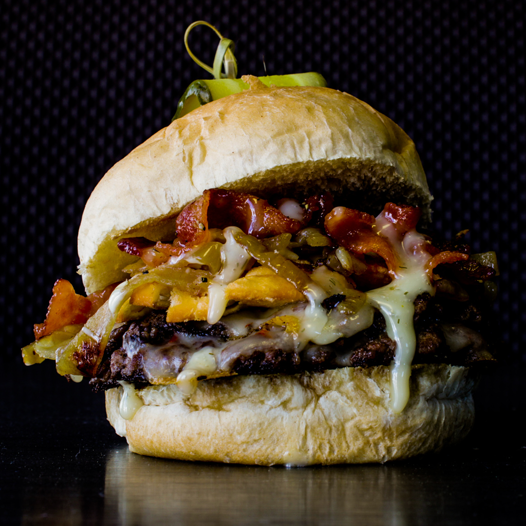 Two Smashed Patties, Honey Dill, Candied Bacon, Pepperjack Cheese, Sauteed Onions and Chopped Perogies.