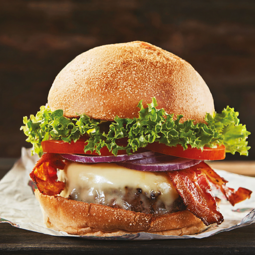 Beef Patty, Smoked Bacon, Lettuce, Tomatoes, Onions, House-Made Beer and Maple Sauce, and Smoked Gouda on a Potato Bun.