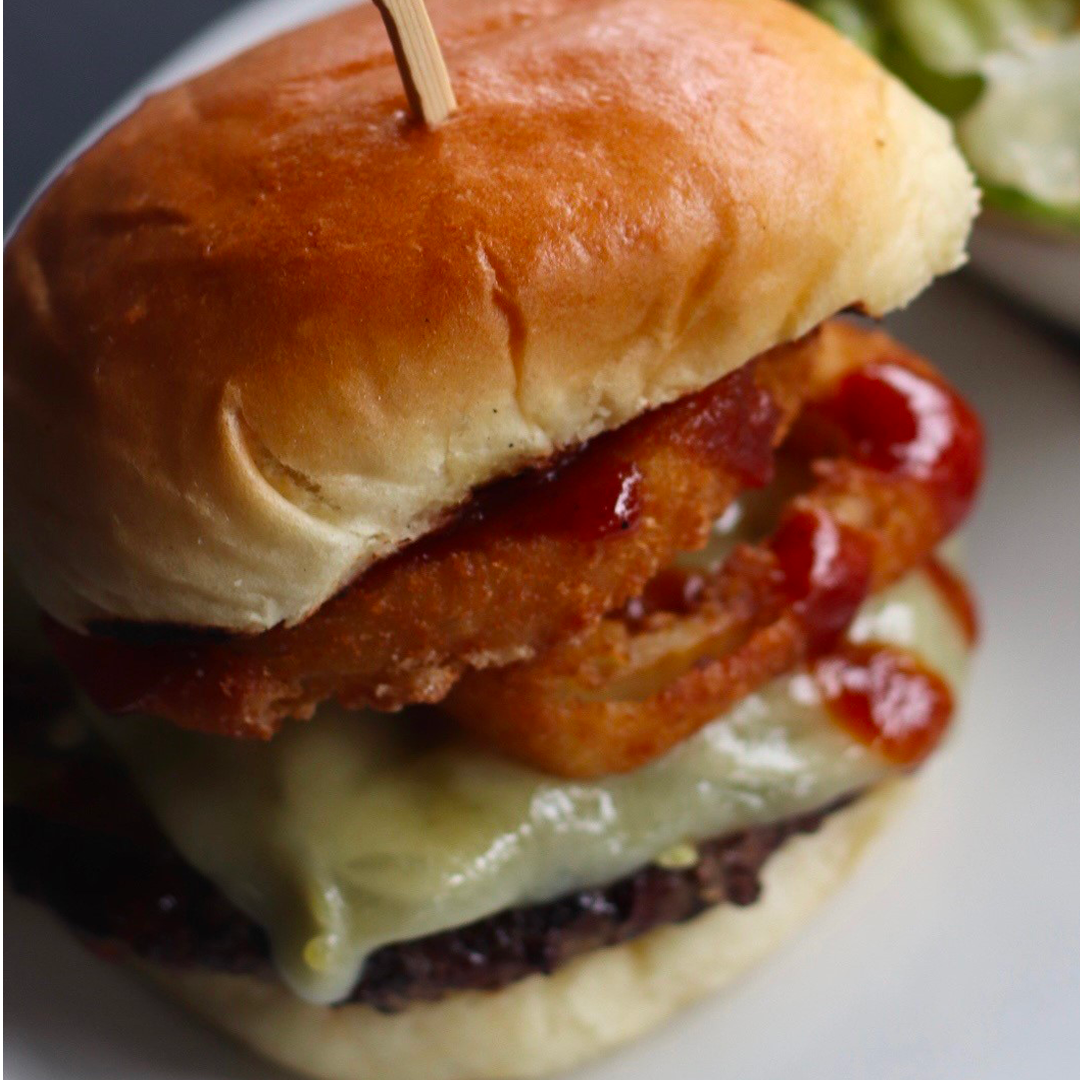A 6oz House-Made Canadian All-Beef Patty topped with Aged White Cheddar, Pickled JalapeƱo, BBQ Sauce, and Onion Rings served on a Stone Crock Bakery Bun.