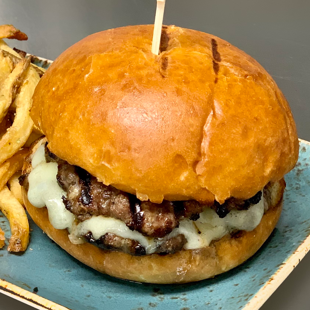 Brioche Bun, Black Garlic Mayo, Ontario Cheddar, Seasoned Beef Patties.
