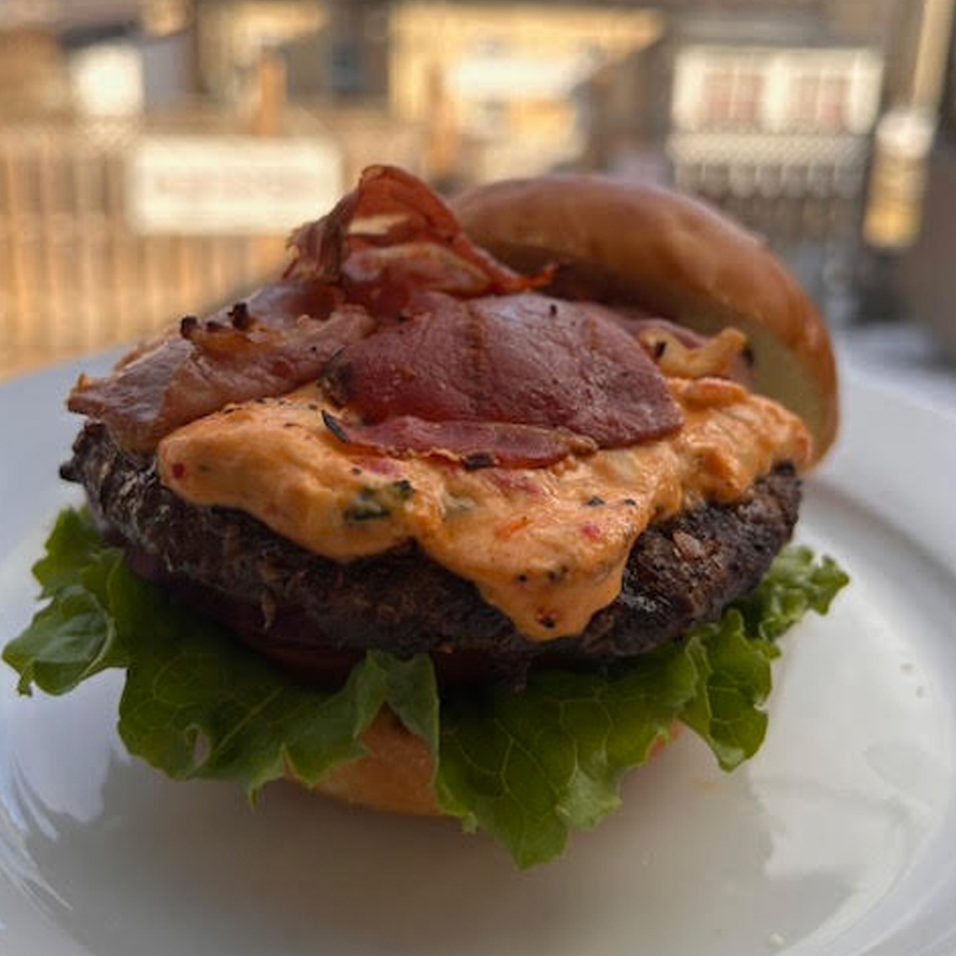 6.5oz Ralph Bos Meats Patty topped with in-house Prepared Tuscan Dip, Crisp Prosciutto, Lettuce, Tomato, Onion on a Brioche Kaiser.