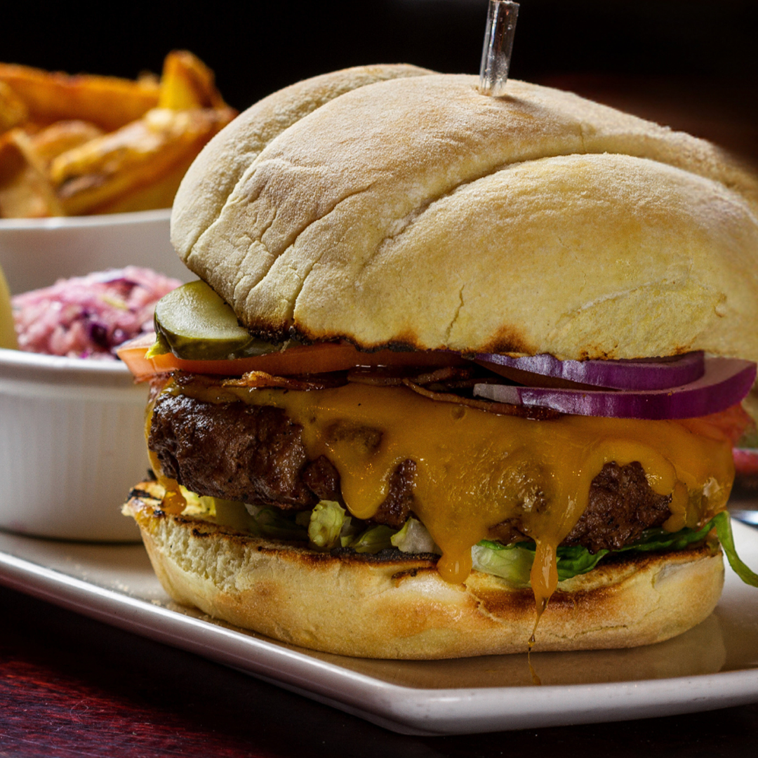 An 100% Brisket Patty topped with Cheddar Cheese, Bacon, Maple Syrup, Lettuce, Tomato, Red Onion, Pickle and House-Made Sauce served on a Toasted Bun.