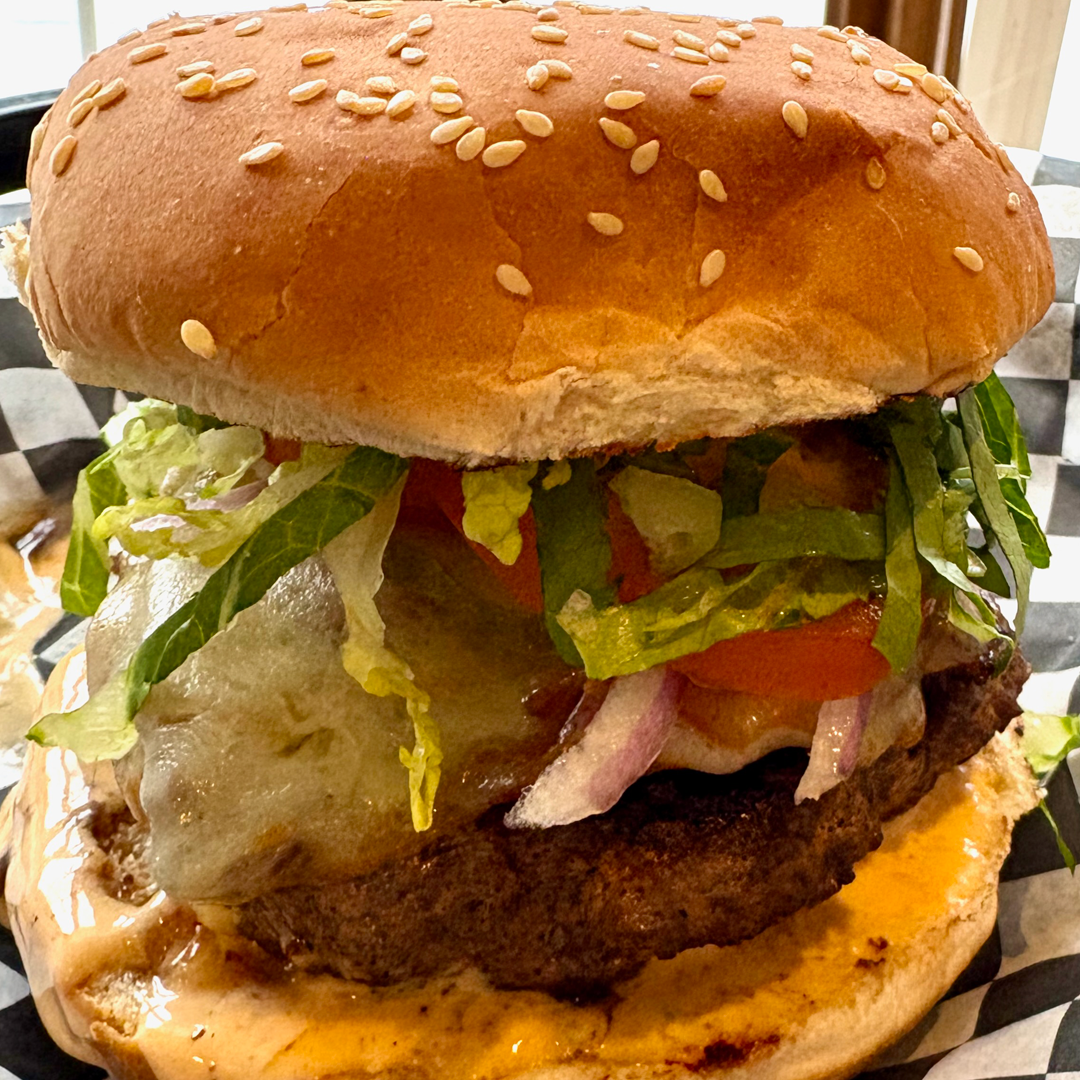Fresh All-Beef Canadian Patty topped with Canadian Balderson Smoked Cheddar Cheese, Canadian Smoked Strip Bacon and Canadian 1000 Islands Dressing, Lettuce, Pickle, Tomato, on a Toasted Dempsters (Canadian) Sesame Bun