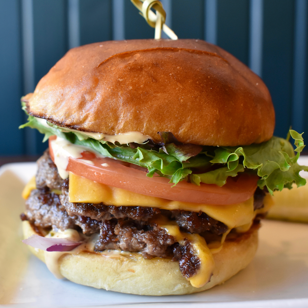 Two 4oz Fresh Canadian Beef Patties, American Cheese, Awesome Sauce, Red Onion, Tomato, and Greens served on a Toasted Bun.