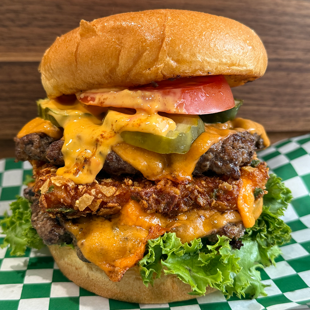 Two 1/4lb All Beef Burgers topped with Cheddar Cheese, Lettuce, Tomato, Pickles, Red Onions, Cheesy Queso Sauce and a Dorito Infused Breaded Cheese Stick.