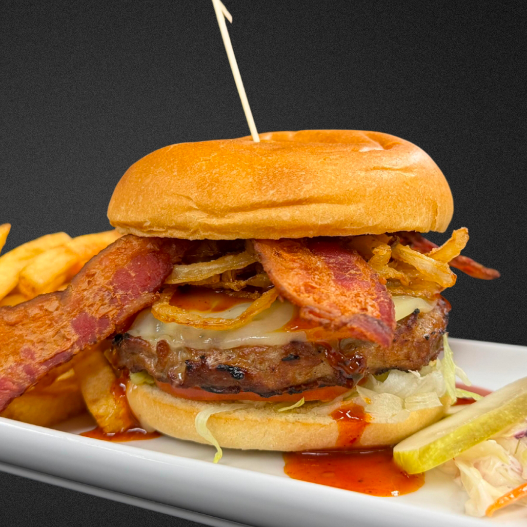 Perfectly cooked Beef Patty, Pepper Jack Cheese, Bacon, Chipotle Barbeque Sauce.
