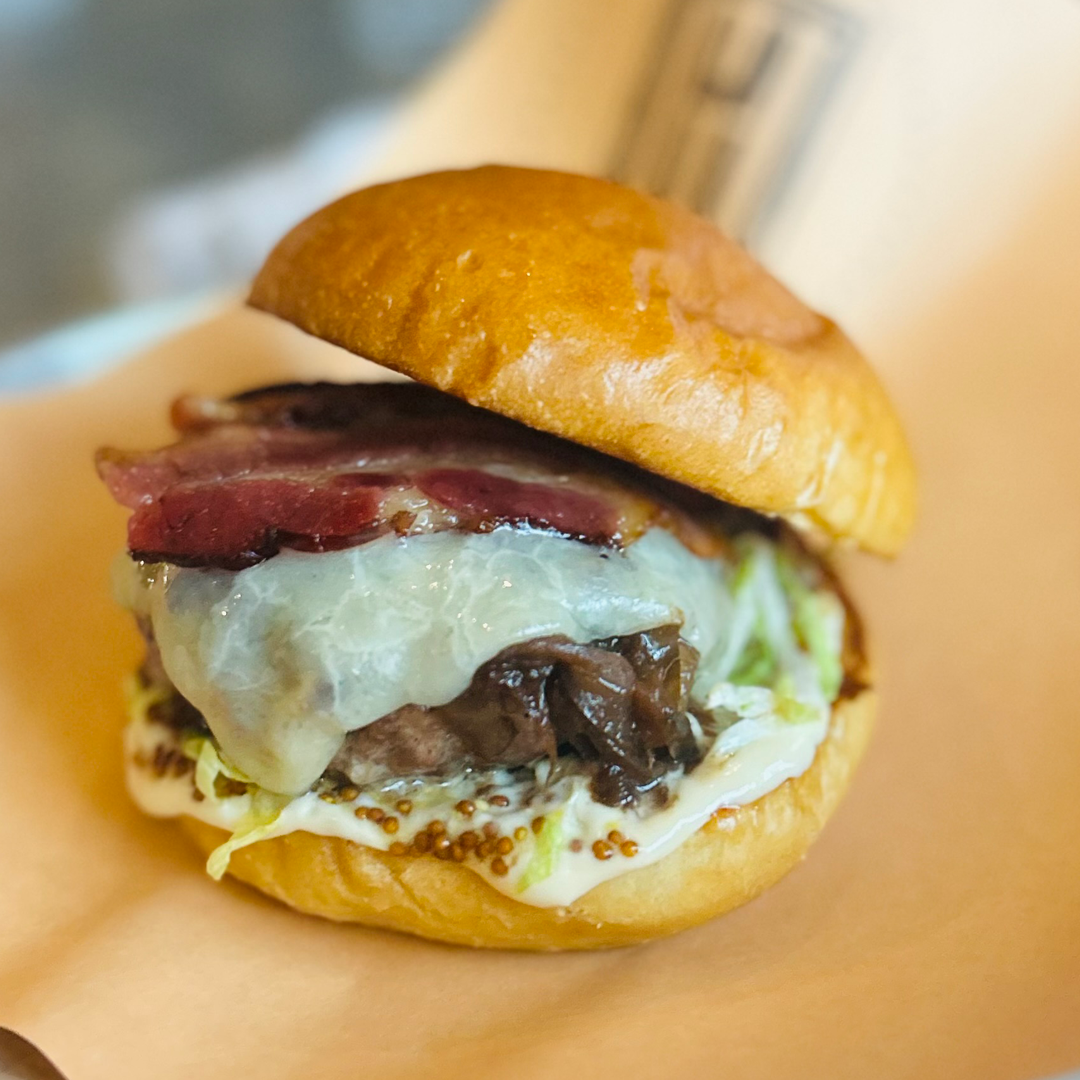 6oz Cumbrae Farms Ground Beef Brisket Patty, Soft Ace Bakery Roll, Aged White Cheddar, Double Smoked Bacon, Horseradish Mayo, Grainy Beer Mustard, Sauteed Red Wine Onions, Shredded Lettuce.