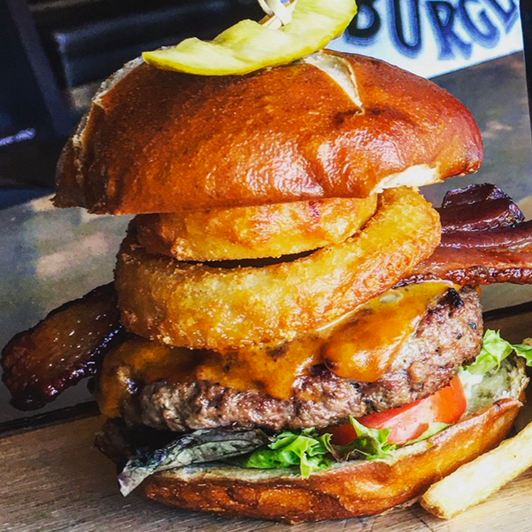 7oz Canadian Beef Patty topped with Cheddar, Thick Cut Maple Bacon, and Onion Rings, served between our Pretzel Bun with Garlic Aioli, Lettuce and Tomato.