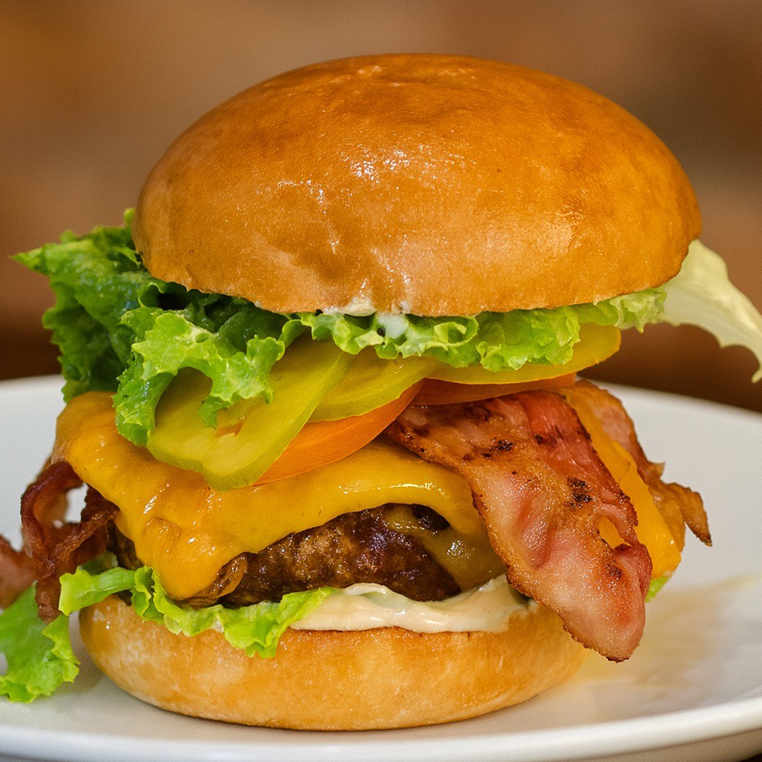 Ground Chuck, Smoked Bacon, Cheddar Cheese, Mushrooms, Lettuce, Tomatoes, Onions, Pickles and Brioche Bun.