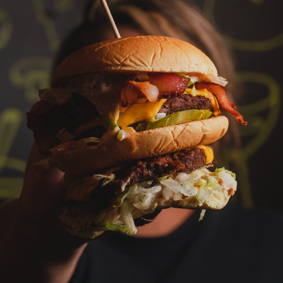 Two 4oz 100% Alberta Benchmark Ranch Angus Beef Patties, Bacon, Cheddar, Pickles, Diced Onions, Lettuce and Eddie Sauce served on a Three-Layer Toasted Bun.