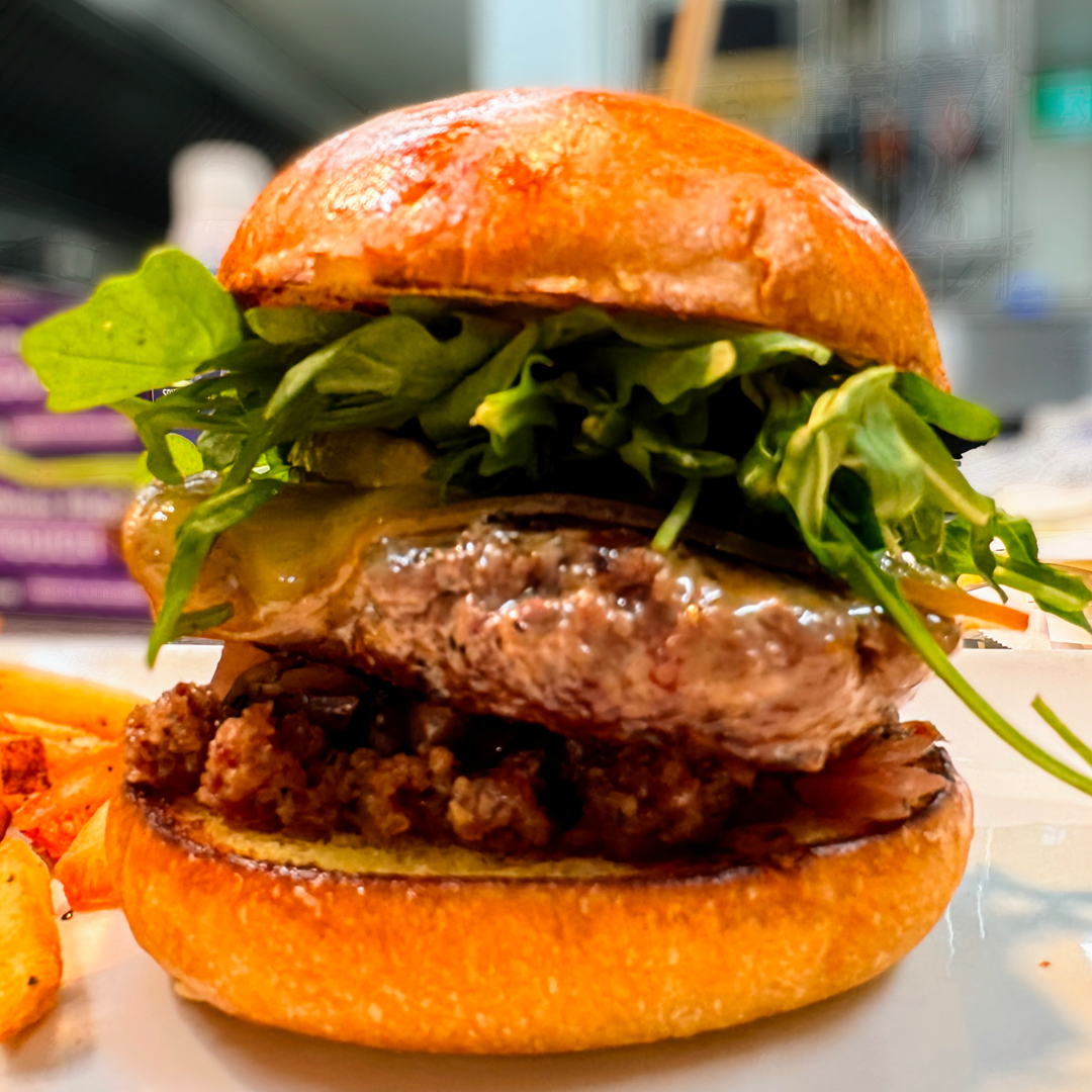 Sunrise Ranching Co. Beef, House-Made Bacon Jam, Grilled Red Onion, Smoked Cheddar, Arugula, Bread & Butter Pickle, Brioche Bun.