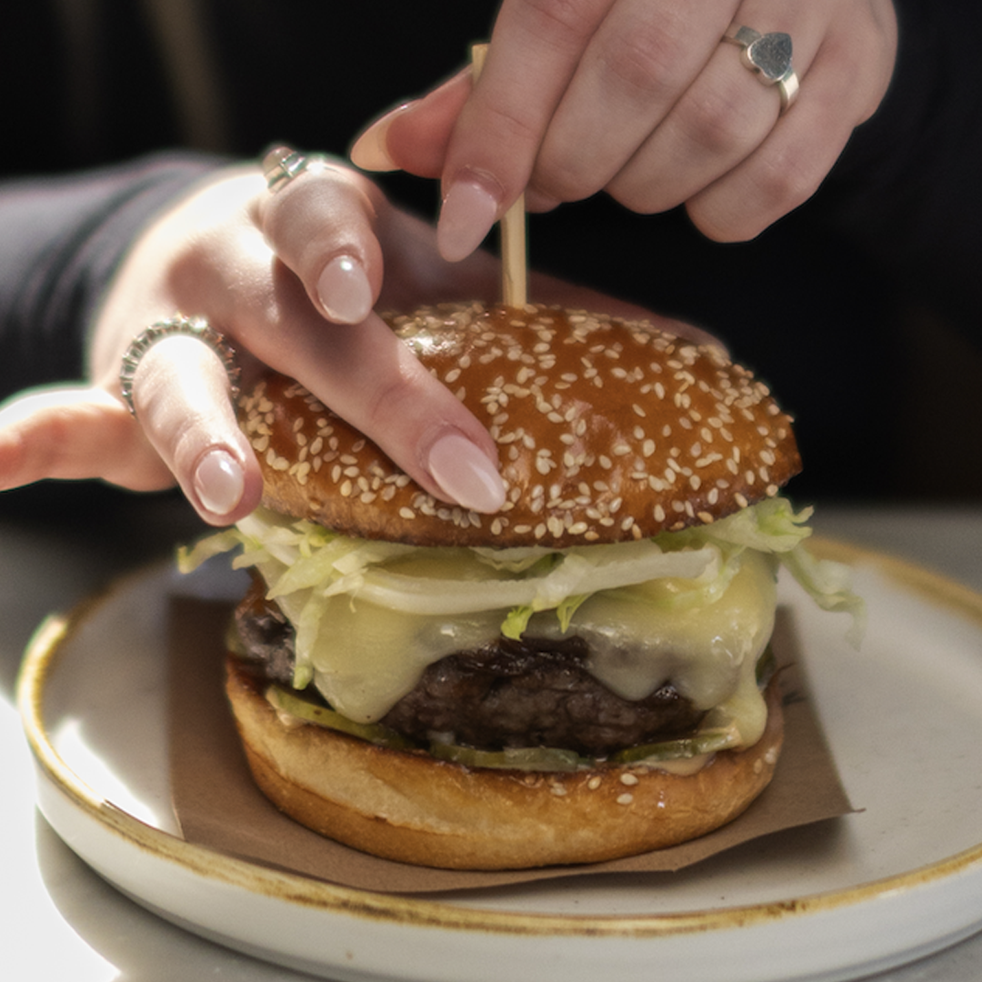 A Canadian Angus Beef Patty, Melted Onions, Fontina Cheese, and Dijon Burger Sauce served on a Toasted Bun.