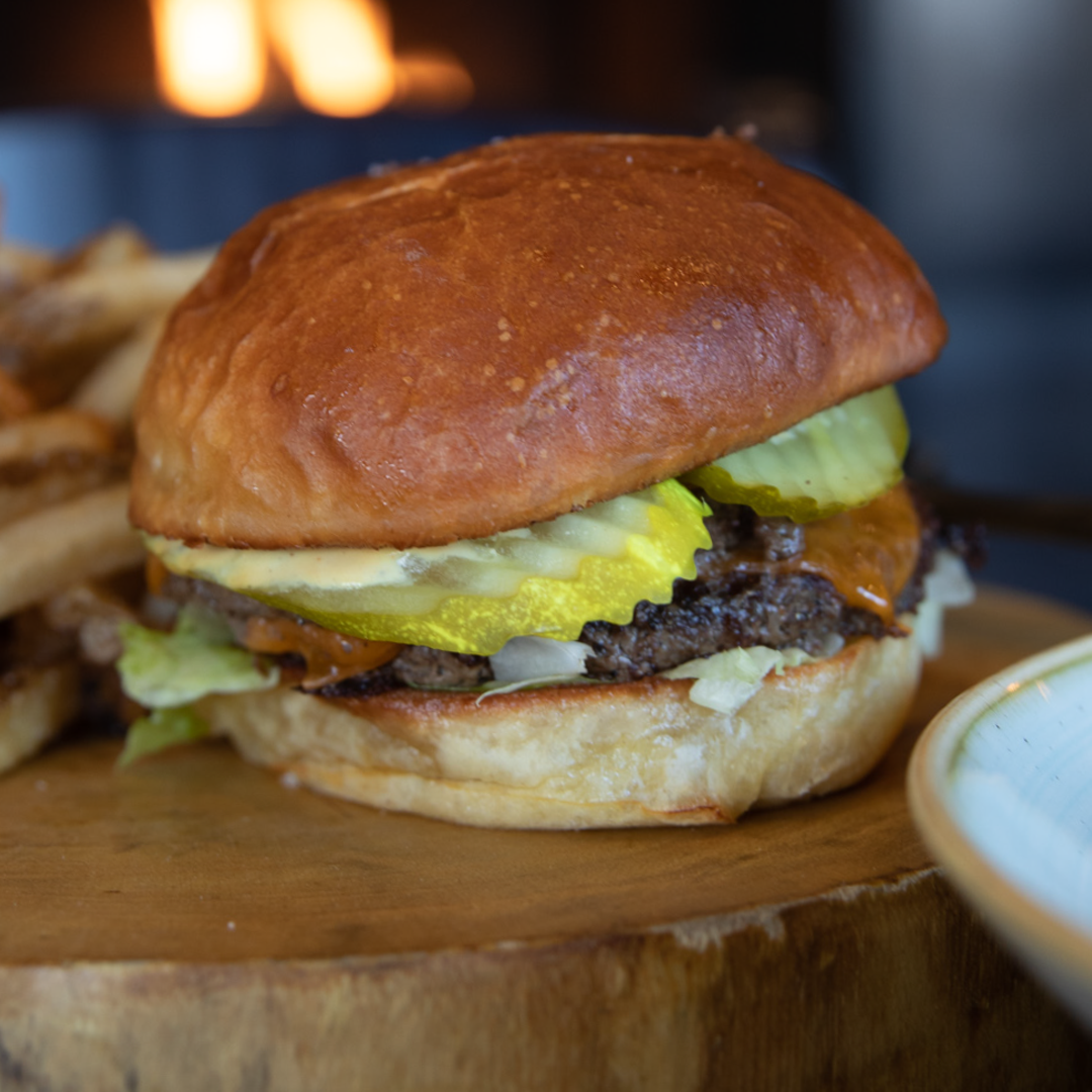 Two 100% Alberta Benchmark Ranch Angus Beef Patties, Iceberg Lettuce, Pickles, Cheddar Cheese and Park Sauce served on a Brioche Bun.