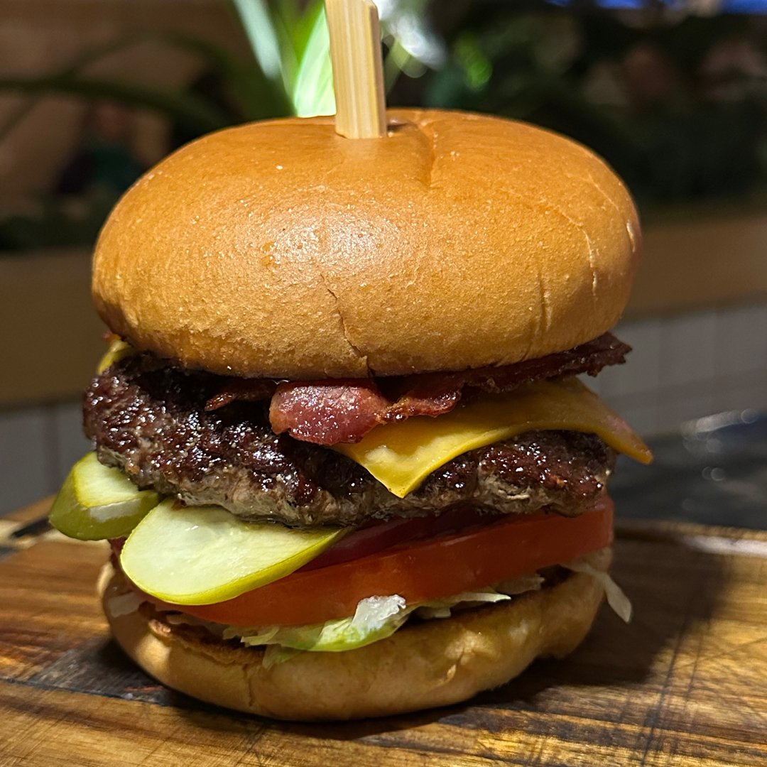 6oz Patty, House Aioli, Shredded Lettuce, Tomato, Pickles, Onion, American Cheese, Bacon, on a Brioche Bun.