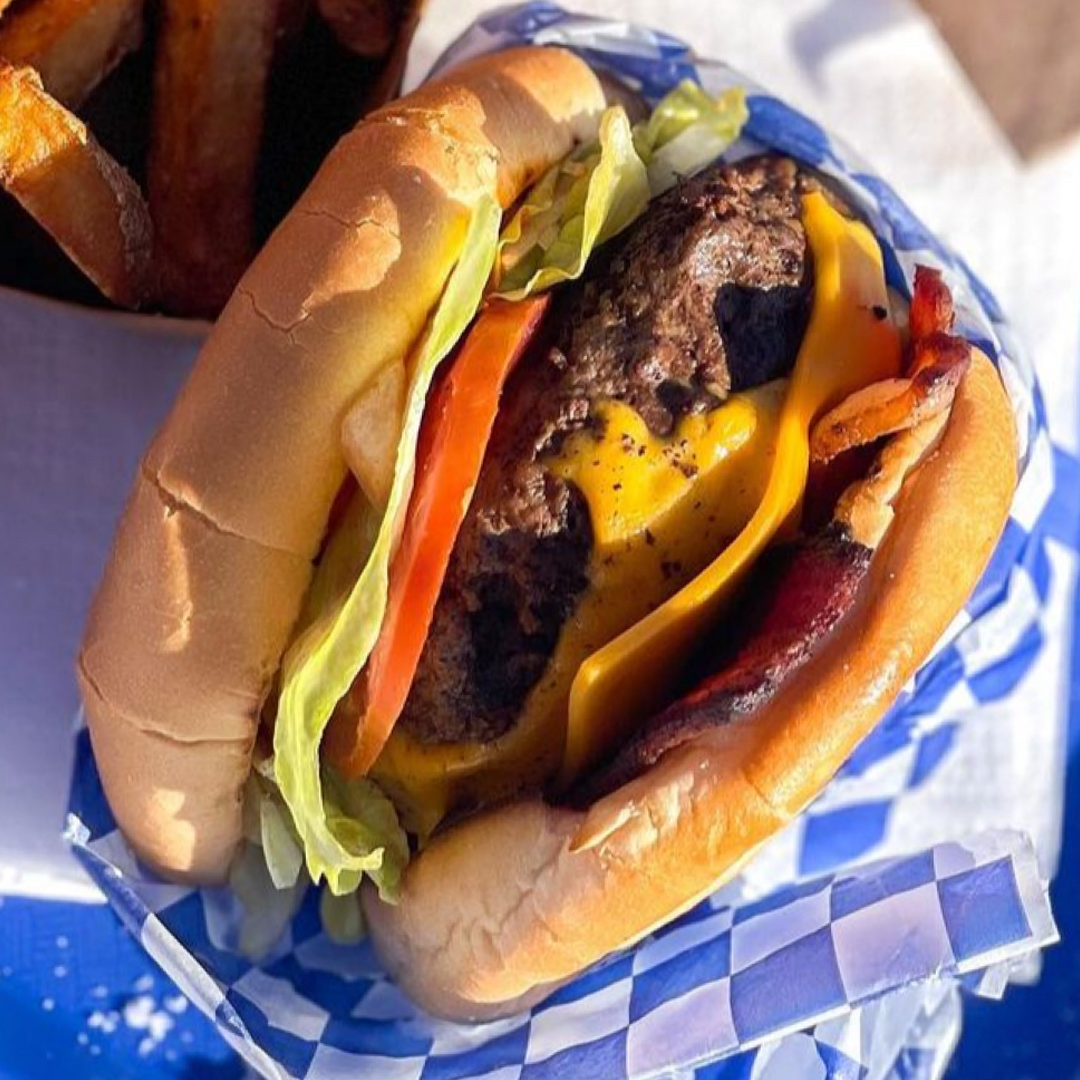 A 9oz Beef Patty, Cheese, Bacon, Mustard, Relish, Lettuce and Tomato served on a Classic Burger Bun.