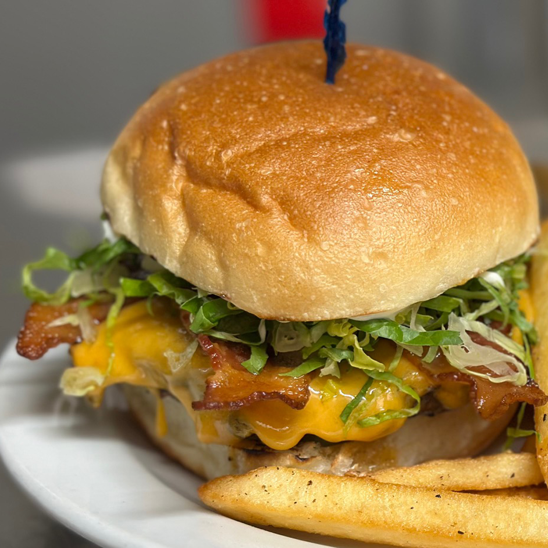 6oz Beef Patty, Mayo, Lettuce, Pickles, Onions, Cheddar, Bacon served on a Locally Sourced Bun.