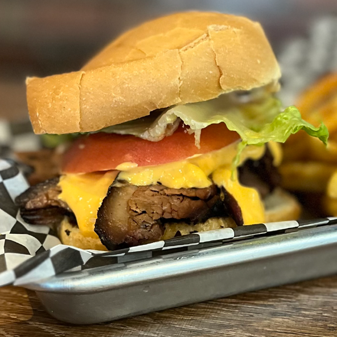 A 5oz AAA Brisket Patty, Sweet Malases BBQ Sauce, Queso Cheese, Lettuce and Tomato served on a Toasted White Bun.
