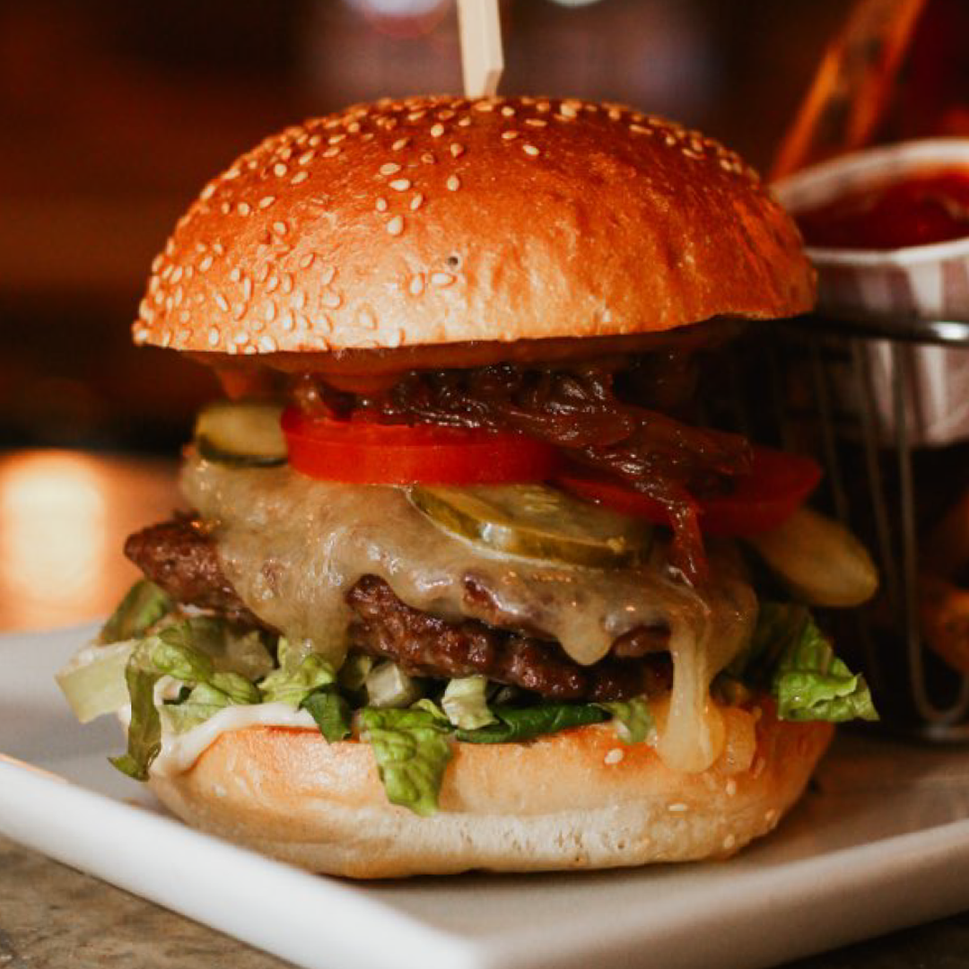 Two AAA Alberta Beef Patties, Aged Cheddar, Leaf Lettuce, Tomato, Pickle, Caramelized Onions, BBQ Sauce and Baconaise served on a House-Made Sesame Bun.