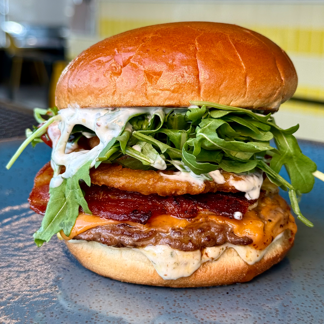 1 Egg Scrambled, 1 Smashed Patty, House Cured Bacon, Onion Rings, Cheddar, Arugula, Lemon Basil Aioli, Toasted Potato Bun.