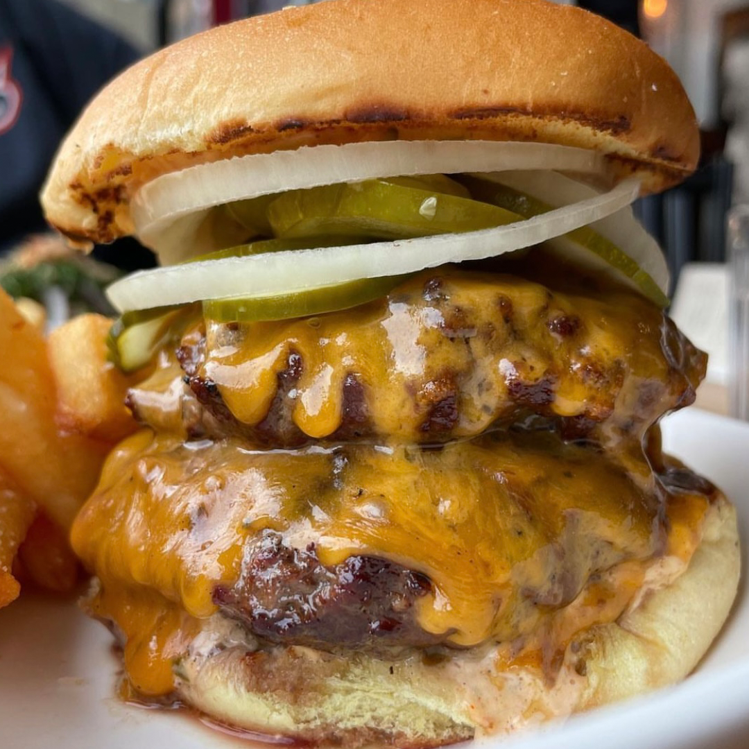 1/2 lb House Ground Chuck Burger, Cheddar, Onions, Pickles and Burger Sauce.