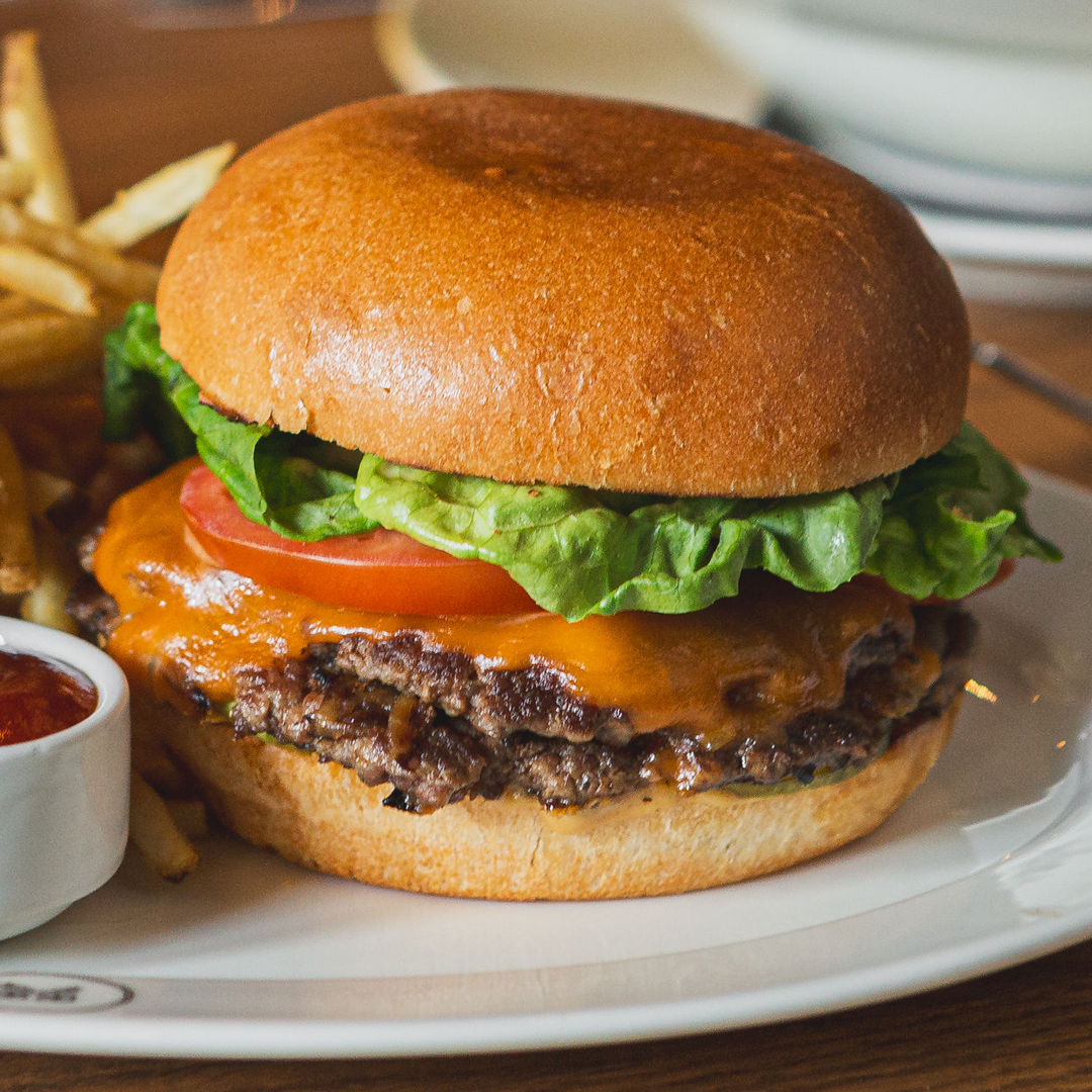 Two Smashed Alberta Beef Patties, Tomato, American Cheese, Lettuce, Onion, Pickle, Housemade Sauce.