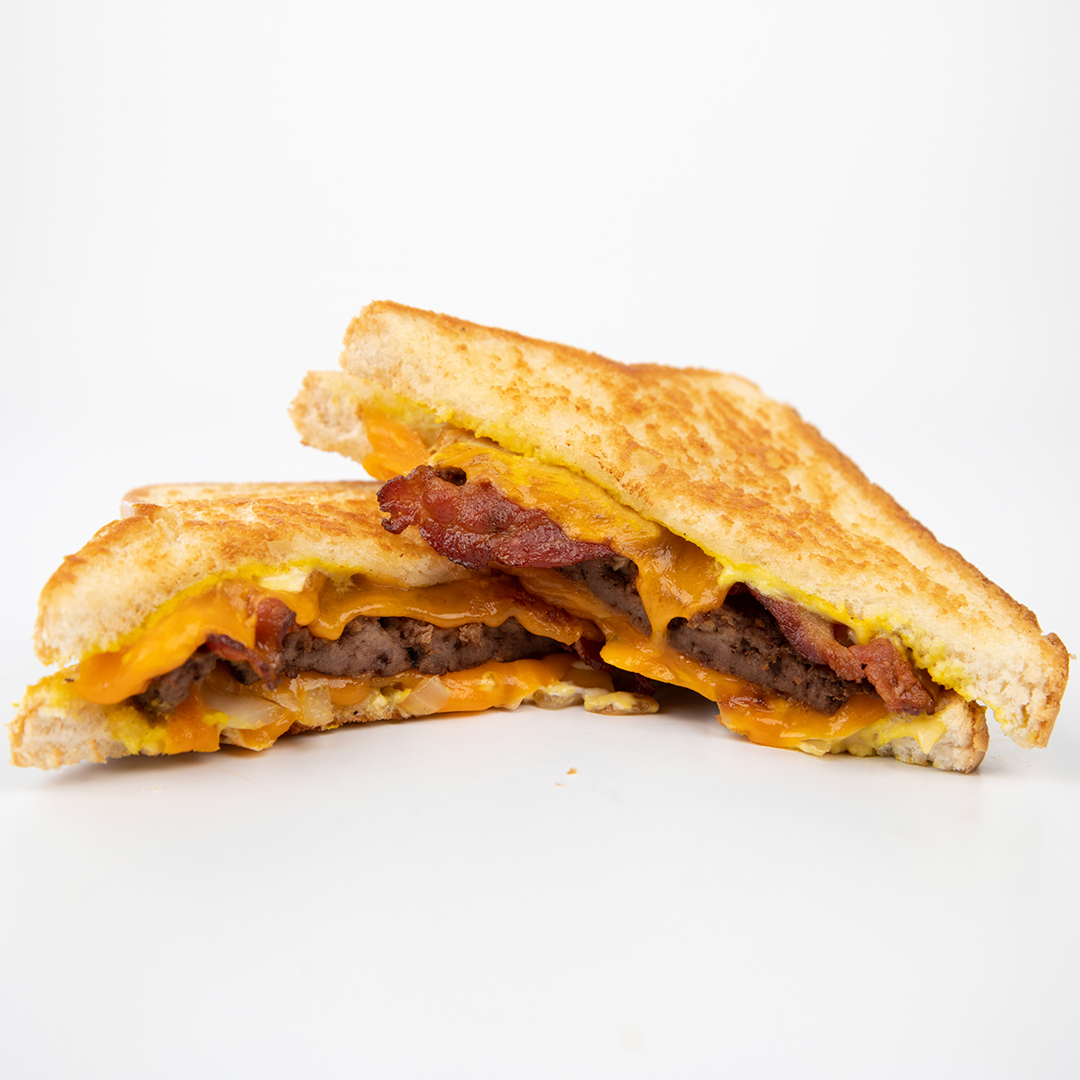 A Seasoned Beef Patty squeezed and grilled between Two Slices of Buttered Bread with Grilled Onions, Mayo, Mustard and Two Slices of Cheddar.