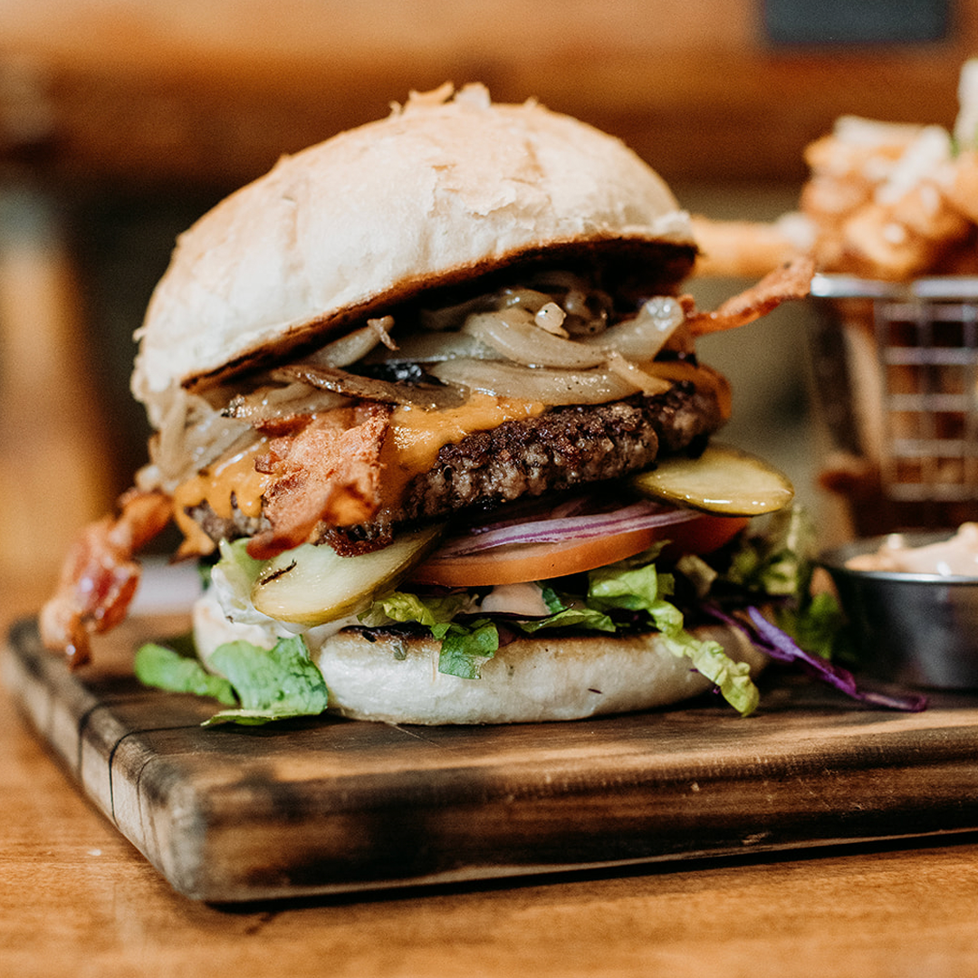 6oz Beef Patty, Melted Cheddar Cheese, Bacon, Caramelized Onions, Lettuce, Tomato, Pickle, Red Onion, Beacon Sauce.