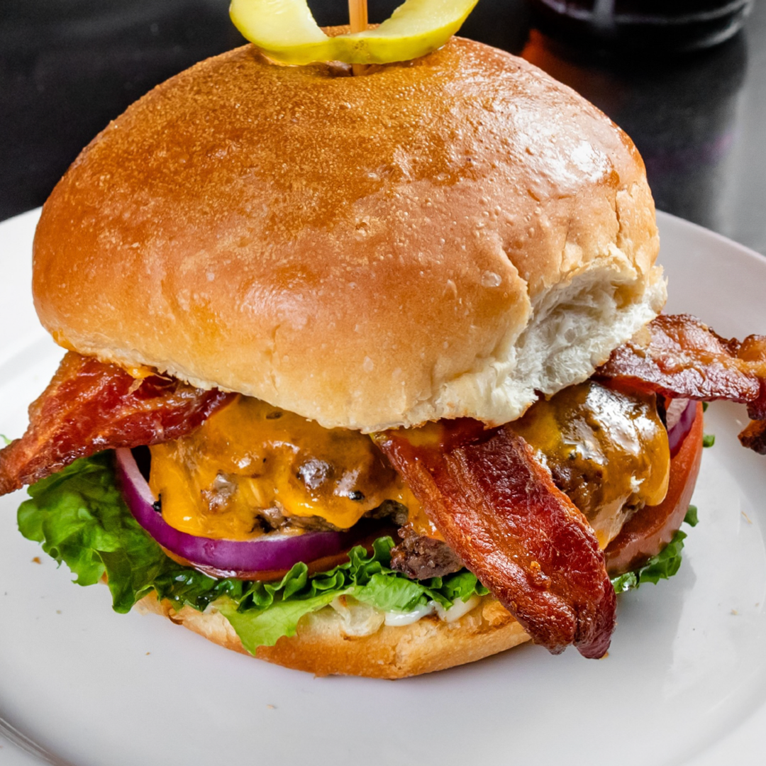 A Homemade 8oz Canadian Beef Patty, Crisp Bacon, Cheddar Cheese, Lettuce, Tomato, Red Onion, House-Made Mayo, Mustard, Ketchup served on a Kaiser Bun with a Pickle Sail.