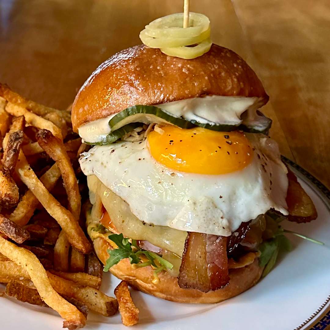 A 6oz AAA Alberta Beef Patty, Applewood Smoked Cheddar, Double Smoked Bacon, Arugula, Fresh Tomato, House-Made Dill Pickle, Crispy Shallots, Sun-Dried Tomato Aioli, and Garlic Aioli served on a House-Made Brioche Bun.