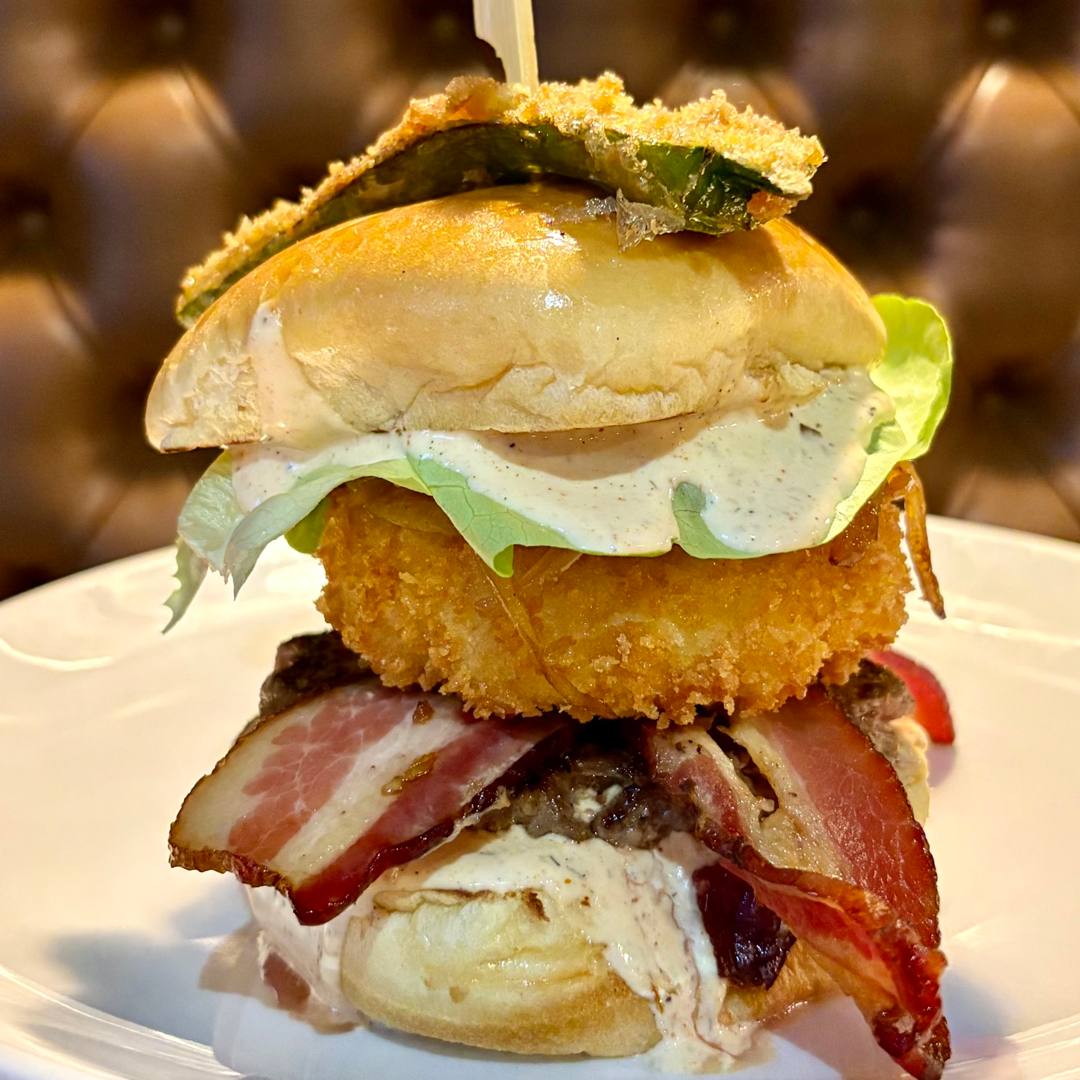 Beef Patty, Bacon, Cream Cheese and Candied Jalapeño Croquette, Caramelized Onions, Smoky Ranch, Butter Lettuce, Deep Fried Pickled Jalapeno Topper.