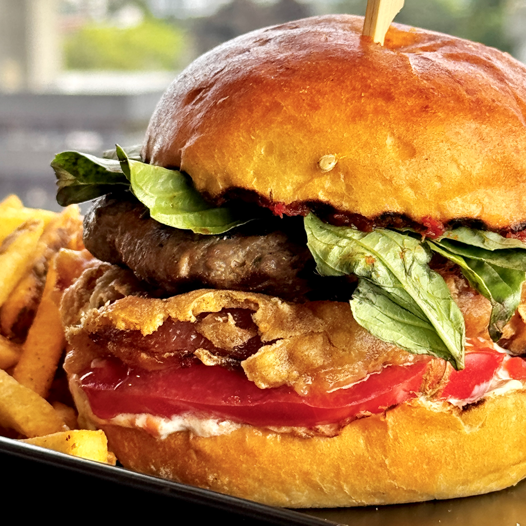 Canadian Beef, Fresh Basil Leaves, Sliced Tomato, Balsamic Onion Rings, Sundried Tomato Jam, Mayo, Golden Potato Bun.