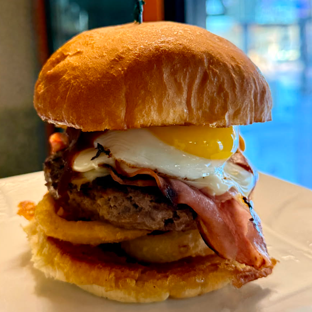 Beef Patty on a Fresh Brioche Bun topped with Cheddar Cheese, Swiss Cheese, Ham, a Fried Egg, Onion Rings and BBQ Sauce.